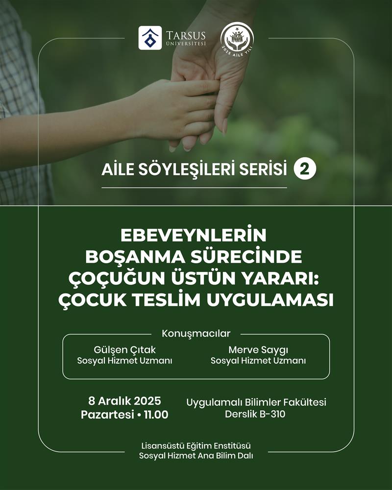 Üniversitemiz Lisansüstü Eğitim Enstitüsü ile Sosyal Hizmet Anabilim Dalı iş birliğiyle düzenlenen “Aile Söyleşileri”nde, “Ebeveynlerin Boşanma Sürecinde Çoçuğun Üstün Yararı: Çocuk Teslim Uygulaması